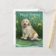 Happy Birthday Golden Retriever Puppy Dog painted Postcard. This postcard features a paining of a blonde Golden retriever pup sitting sitting by the water surrounded by green grass and yellow flowers. She is ready to help you send Birthday Greetings to your family and friends. Doggy postcards are an economical alternative to full size greeting cards when you just want to send a quick note of cheer.