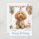 Cute cartoon illustration of Goldendoodle dogs wearing a birthday hat surrounding a birthday cake and balloons. Perfect for pet lovers or dog parents.
