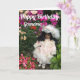 A cute little black doll in Victorian style dress among flowers with the text Happy Birthday grandma