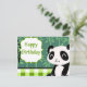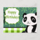 An adorable design of a cute, cartoon, black and white, little panda. In the design, it says "happy Birthday" in green text. The background is green, with light green colored bamboo, and a bright green gingham pattern. Very cutesy and colorful. Great for anyone looking for cute panda designs that say "happy birthday," on it.