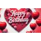 Happy Birthday text in a stylized, decorative font with pretty balloons and red background.