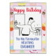 Central heating plumber and plumbing cartoon. Heating Engineer is working on fixing a boiler. Personalise with your own details and message. Cupcakes background. Birthday card for a heating engineer.