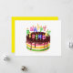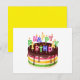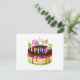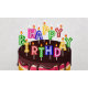 A colorful layered birthday cake with chocolate topping and the "text" Happy Birthday!