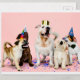 A joyful scene of five playful dogs wearing colorful party hats, surrounded by confetti.