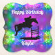 Happy Birthday Horse Hunter Jumper Equestrian - Stunning silhouette of horse and rider going over a vertical jump. Design says Happy Birthday on top and can be personalized with the name of your horseback rider on the bottom.