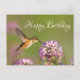 This stunning hummingbird postcard features a beautiful photo of a rufous hummingbird sipping nectar from a rocky mountain bee flower with the message, "Happy Birthday." Photography created by award-winning photographer Maria Jeffs.