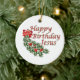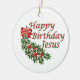A Christmas ornament with a sprig of holly and the text, "Happy Birthday Jesus."
