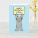 A cute cartoon grey cat holding up above his head a pale yellow banner that says 'Happy Birthday John'.