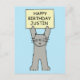 A cartoon grey cat holding up a lemon colored sign that says 'Happy Birthday Justin'.