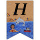 This flag shaped bunting banner has a lady and her black and white cat swimming in the ocean in colorful inner tubes with the sandy beach behind them and a gray dolphin jumping out of the water. Customize the Happy 40th Birthday text with the templates.