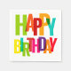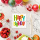 A vibrant birthday Napkin featuring bold, multicolored letters spelling "Happy Birthday". The Napkin is placed on a marble surface, surrounded by fresh strawberries and a glass of red drink.