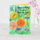 Happy birthday greetings to a special niece-in-law decorated with a colorful summer garden of orange, yellow, pink, and purple flowers hand painted with watercolor with a warm summer green and turquoise blue background. On the inside is a coordinating shade of bright yellow with text you can edit to fit your needs.
