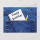 Happy Birthday written on a notebook tucked inside a denim jean pocket.