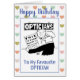 Optician cartoon. Optician gives customer a bill which resembles an eye test chart. Personalise with your own details and message. Funny birthday card for an optician.
