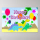 Happy Birthday Party Balloons Dinosaurs Poster. Three cute cartoon dinosaurs: blue Stegosaurus, yellow Diplodocus and green Triceratops on a nice day in a pre-historic landscape with trees, mountain range and vulcanos with color stars and bright colored party balloons and a blue sky with white clouds poster with text: "Happy Birthday!", change/ customize/ change text in any text you like. This cute happy birthday dinosaurs poster print is fully customizable, add your texts and images! A adorable cartoon dinosaur happy birthday party poster for the little big dino fan!