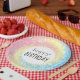 This groovy set of paper plates feature the words "Happy Birthday" with a pastel pink blue and yellow tie dye inspired effect in the background. Perfect for a tie dye or 60s themed birthday party!