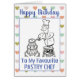 Pastry Chef cartoon. Woman is at top of a stepladder icing a cake. Personalise with your choice of wording and inside message. Birthday card for a pastry chef.