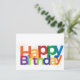 A postcard with the words "Happy Birthday" in colorful, overlapping letters, with small firework bursts around the letters. The word "Happy" is on top, with the "H" in orange, "a" in red, "p" in yellow, "p" in green, and "y" in blue. The word "Birthday" is below, with the "B" in purple, "i" in blue, "r" in red, "t" in yellow, "h" in green, "d" in orange, "a" in red, and "y" in yellow. The background is white.