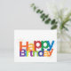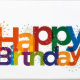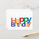 A vibrant birthday postcard featuring colorful letters spelling "Happy Birthday.