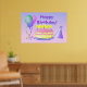 Celebrate the birthdays of your family and friends with this colorful Happy Birthday Poster. A two layer birthday cake with candles is surrounded by balloons and a striped party hat. Colors are pink, light blue, green, and yellow.