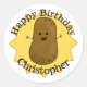Fun brown potato with a big happy smile and stick arms. Above are the words happy birthday and below a template to add your name. Behind is a 12 point yellow star with an orange outline.