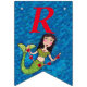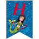 This flag shaped Happy Birthday bunting banner is a mix of blues resembling ocean waves with a dark haired pretty mermaid with a green tail holding a gold string of red hearts. Customize the birthday year with the templates.