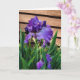 Happy Birthday Friend. Pretty purple flowers. Photograph of Iris flowers and distressed brown wood.