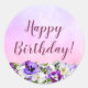 A violet and pink gradient colored background and a border of violet, purple and white pansies. Dark pink colored and hand lettered style script and the text: Happy Birthday!