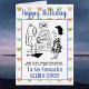 Scuba Diver Cartoon. Diver wears scuba diving outfit to feed fish in his fish tank. Personalize with your choice of wording and inside message. Birthday card for a diver, scuba diver, or PADI instructor from a diving school.