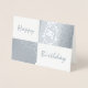 Send an eye-catching birthday card featuring bold asymmetrical checkered rectangles in silver foil and white. The white rectangles on the upper left and lower right contain the customizable words "Happy" and "Birthday." Inside the text reads, "May it be spectacular!" which can also be personalized.