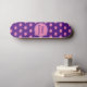 Purple background with pink polka dots... pink center circle with purple lettering... lavender accents...