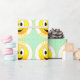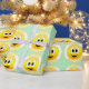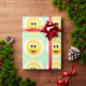 Cute Happy Birthday yellow face wrapping paper. Big round yellow happy face with the words Happy Birthday wrapped round the edge of the face. In the background is a repeat pattern of birthday confetti on a mint green background.
