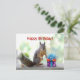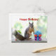 Photo of a cute squirrel standing next to two small wrapped presents and looking straight at the camera. "Happy Birthday!" is the caption, in red type.