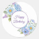 Small round happy birthday sticker is shown with a lovely blue and purple floral print.