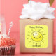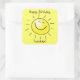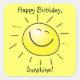 Square sticker to match our "Happy Birthday Sunshine" invitation with an image of a smiling yellow sun and the optional sentiment “Happy Birthday, Sunshine!" on yellow. See matching custom-cut vinyl sticker, card, envelope, favor bag, favor box, favor tag and label. See the entire Birthday Sticker collection in the INVITES | Stickers & Labels section.