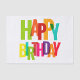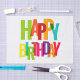 A colorful graphic design with the words "HAPPY BIRTHDAY" stacked on top of each other. The word "HAPPY" is on the top line, and "BIRTHDAY" is on the bottom line. Each letter is a different color, including green, red, orange, yellow, cyan, magenta, and purple. The letters are slightly transparent, causing the colors to mix where they overlap. The background is a plain white with a subtle texture. The overall style is modern and cheerful.