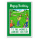 Golfer birthday card. Lucky bounces and ricochets on the golf fairway. Caption says "To the World's Luckiest Golfer!" Personalise with your own details and message.