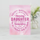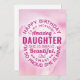 Wish your Daughter a happy birthday with this unique typography badge style card, featuring the message, "Happy birthday to my incredibly amazing DAUGTHER. She is brave, beautiful and smart. I'm so proud she's mine." White type appears on pink floral background. Inside can be customized to fit your needs but has this placeholder text: "Every year, there are new and wonderful things to love about you. You deserve all the happiness in the world, and I hope you realize on your special day how truly and deeply you are loved. HAPPY BIRTHDAY!