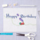 Hop aboard the Birthday Train and join us on this happy day to celebrate. Illustrated with a red and green steam locomotive with purple steam billowing from it’s smoke stack.