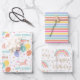 A stylish set of birthday gift wrap with a magical rainbow theme. The first sheet features a cute unicorn surrounded by balloons, hearts and shooting stars. This design is personalized with a birthday age and name. The second sheet has pretty rainbow stripes. The third sheet has a custom name and is illustrated with a rainbow, love heart and stylish script lettering. Each sheet has a matching color palette of peach, pink, yellow, blue-green, lavender-blue and gold.
