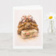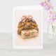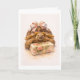 Watercolor illustration with Sulcata tortoise on a gift box and a bow on top. Soft browns and pink pastels. Happy Birthday text with floral flourish inside. Perfect card for a special lady.