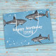 This design features a happy birthday kids' child fun, a blue whimsical ocean shark animal, with wildlife wildlife marine fish, a sea Sealife water beach tropical, a cool unique watercolor blue water, a trendy stylish creative typography, a children's birthday party gift wrap, for kid's children's party supplies, shark fish wrapping paper style, a cute whimsical funny wrapping supplies