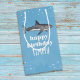 This design features a happy birthday kids' child fun, a blue whimsical ocean shark animal, with wildlife wildlife marine fish, a sea Sealife water beach tropical, a cool unique watercolor blue water, a trendy stylish creative typography, a children's birthday party gift wrap, for kid's children's party supplies, shark fish wrapping paper style, a cute whimsical funny wrapping supplies