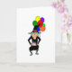 A drawing of a funny looking witch holding a birthday cake and balloons.