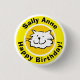 Cat lover Birthday Button Badge. Fun cartoon cat theme. Happy birthday sweets and candy tin which is decorated with the name of the recipient, and the message "Happy Birthday".