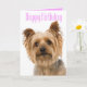 Brighten someone's special day with a Yorkie puppy birthday card! This cute canine card features an image of a Yorkshire Terrier pup with a birthday greeting printed in sweet pink font highlighted against a crisp white background.