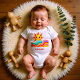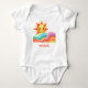 Celebrate a new arrival with this cheerful and vibrant summer baby bodysuit. It features a friendly smiling sun peeking over a series of colorful, flowing rainbow waves in a hand-drawn style. This charming piece makes a perfect gift for a boho-themed baby shower or a first birthday celebration.