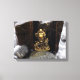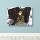 A beautiful canvas print of a golden Happy Buddha protected by a rock as the ocean crashes around him.