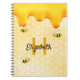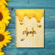 Yellow, white background with a honeycomb pattern. Decorated with sweet, golden dripping honey and happy bumble bees. Templates for your name and monogram letter. Perfect for keeping your notes working from home, your summer recipes or garden, backyard notes.
