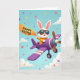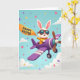 This greeting card shows a friendly, human-like rabbit 🐰 soaring through a bright blue sky while steering a purple biplane, setting a light, affectionate tone like a shared adventure between close friends. The rabbit’s long white ears trail behind as it leans forward in vintage goggles, and its sunny yellow top adds a cozy, companionable warmth to the scene. With an open, happy grin, it grips an orange banner that streams alongside the plane, as if inviting someone special to join the ride. The banner carries a short Easter greeting in dark lettering centered across the fabric, easy to spot against the orange. The plane’s purple body is trimmed with thin white stripes, and a brown propeller at the nose suggests motion as it cuts through the air. Confetti in purple, yellow, and pink drifts around soft white clouds 🌷, like a gentle celebration floating between two people who care about each other. The front design shows the orange banner unfurling beside the purple biplane against the blue sky, with scattered confetti and rounded clouds in the background.